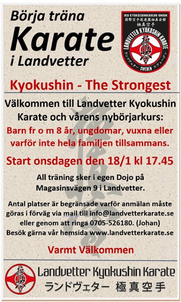 till info@landvetterkarate.se eller genom att ringa 0705-526180. (Johan)