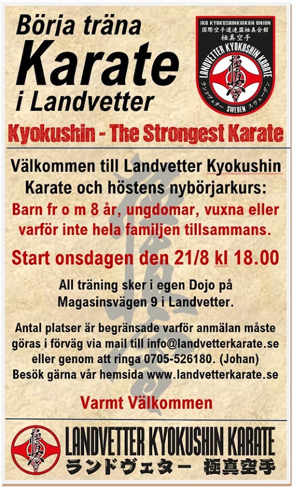 till info@landvetterkarate.se eller genom att ringa 0705-526180. (Johan)
